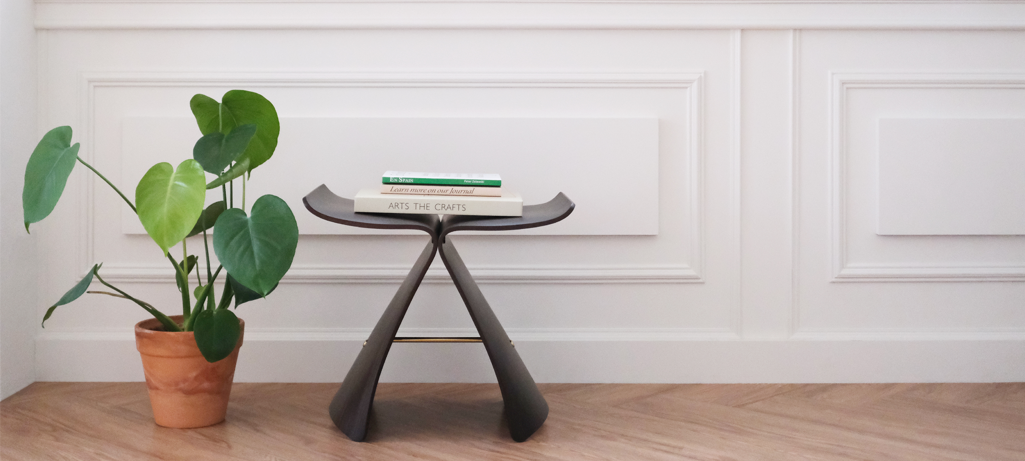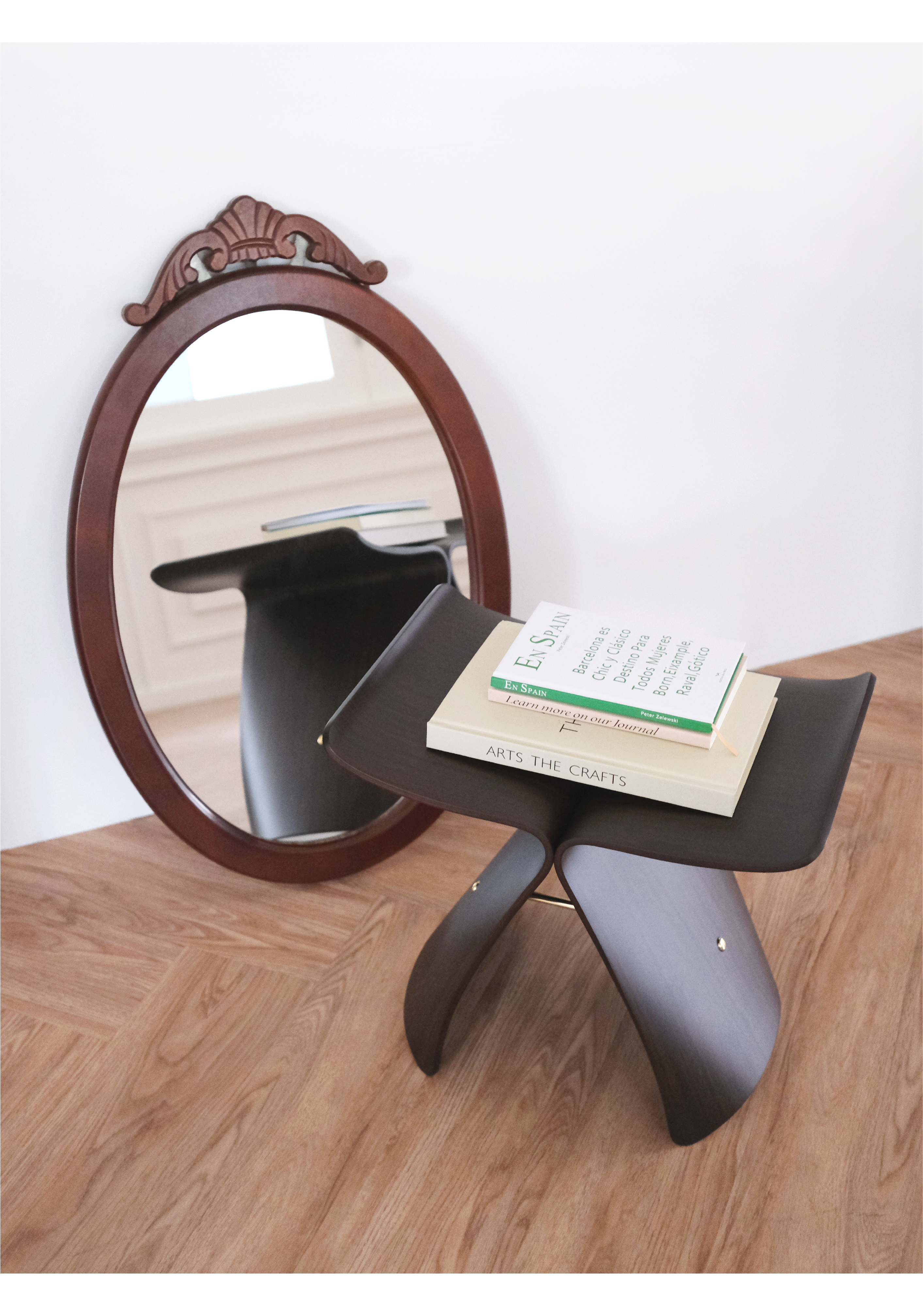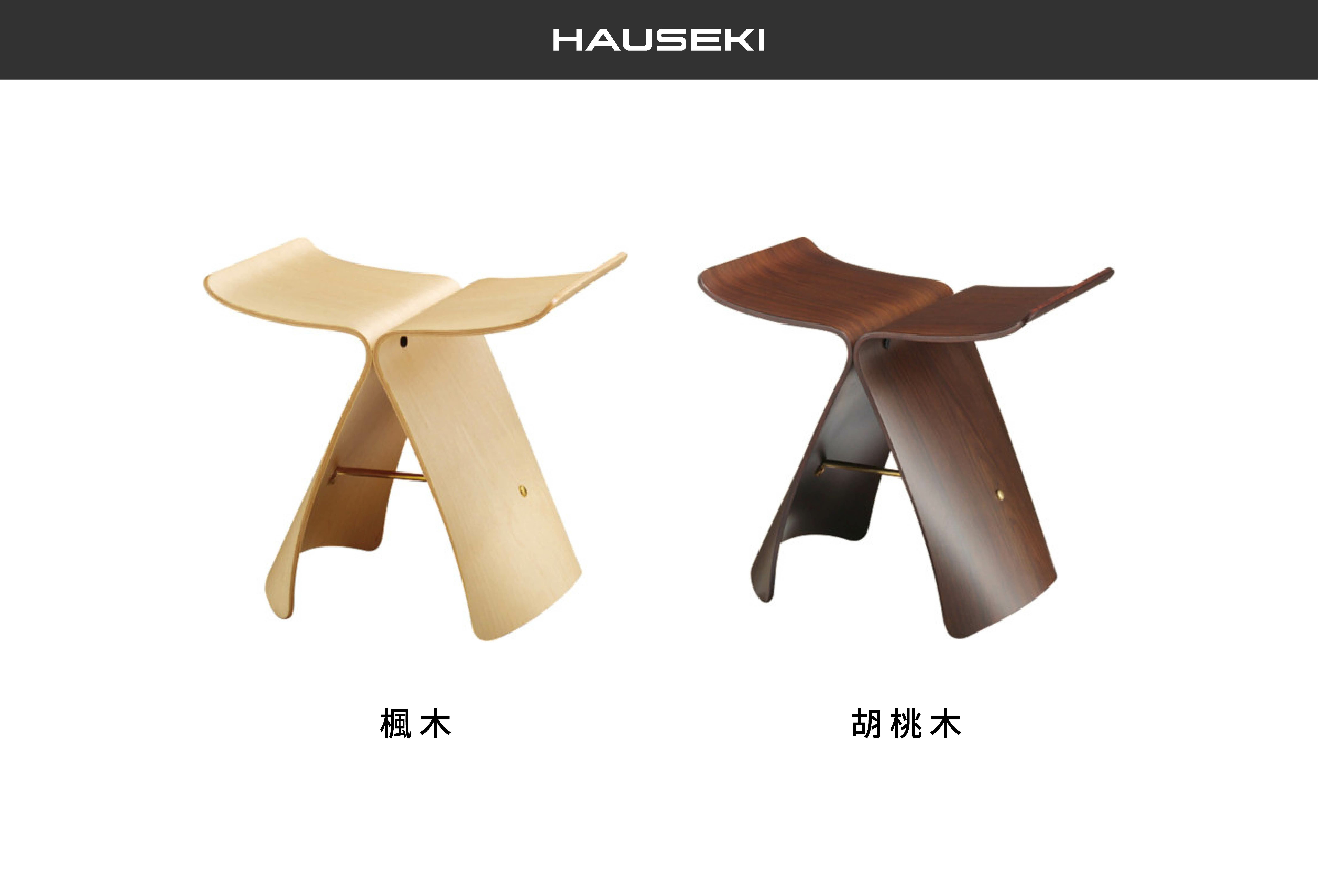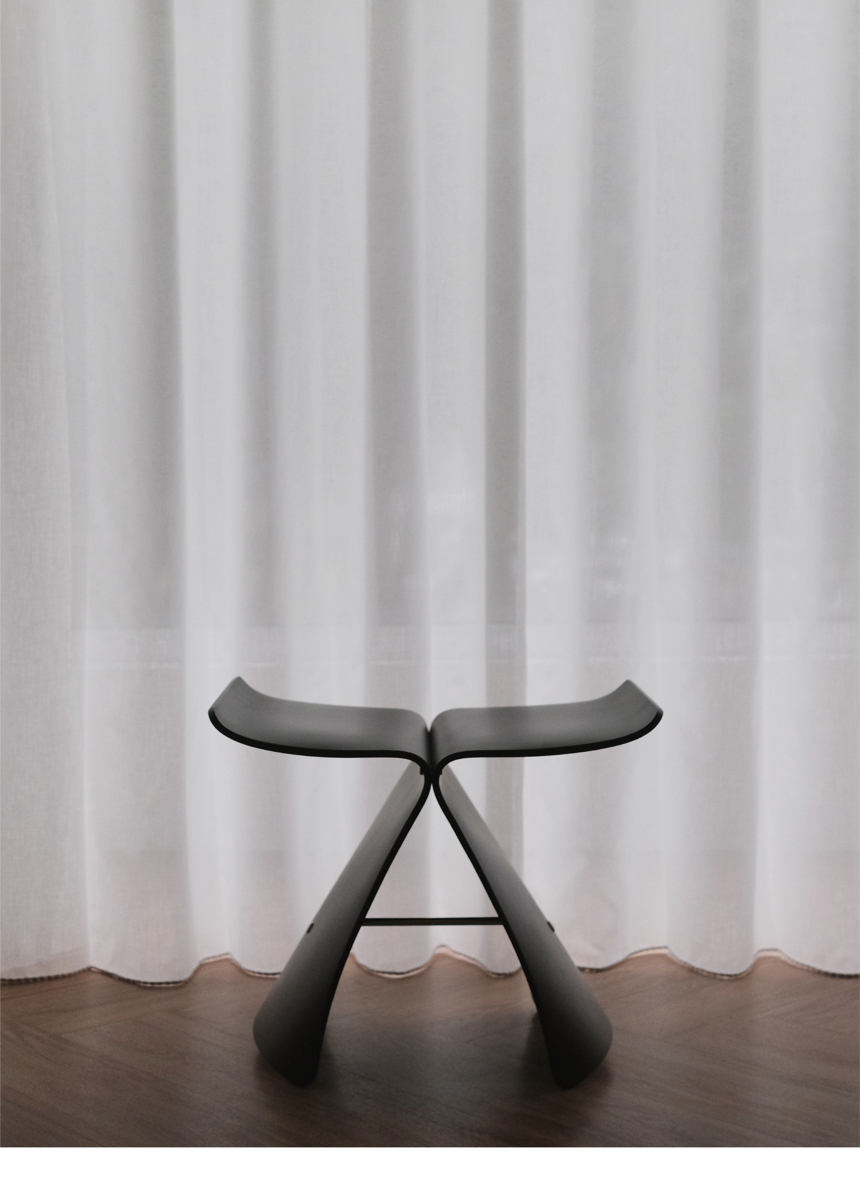 蝴蝶凳由日本設計巨匠柳宗理,僅由兩片立體曲線的壓合版與一根黃銅棒組合而成,將結構精簡化之餘,甚至創造出雋永的有機外型,體現西方極簡主義與東方民藝文化的融合。